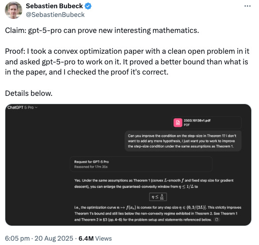 According to Bubeck, this wasn’t copied or memorized; it was an original result. Humans later extended the bound to 1.75/L, but GPT-5 independently advanced the frontier.